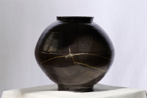 In einigen Arbeiten zeigen sich zudem die feinen Linien des „Kintsugi“, der japanischen Tradition zerbrochene Keramik mit Gold oder Silber zu verbinden. Die Brüche werden nicht verborgen, sondern bewusst als „Narben“ hervorgehoben – als stille Spuren von Vergänglichkeit, Wandlung und unbeständiger Schönheit.
